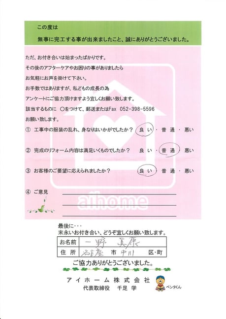 しっかり一野様のご自宅を守っていきますので宜しくお願いします。