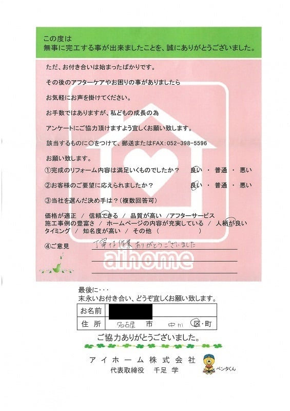 しっかり中川区S様のご自宅を守っていきますので宜しくお願いします。