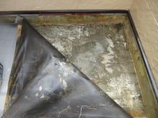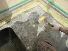 既存の防水シートを剥がし、タックシートを貼りプルーフロンPG工法で直しました。