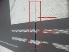 確認した所、玄関の上のシミは外壁材と外壁材の重なり部分が年月が経ち浮いている事が原因で